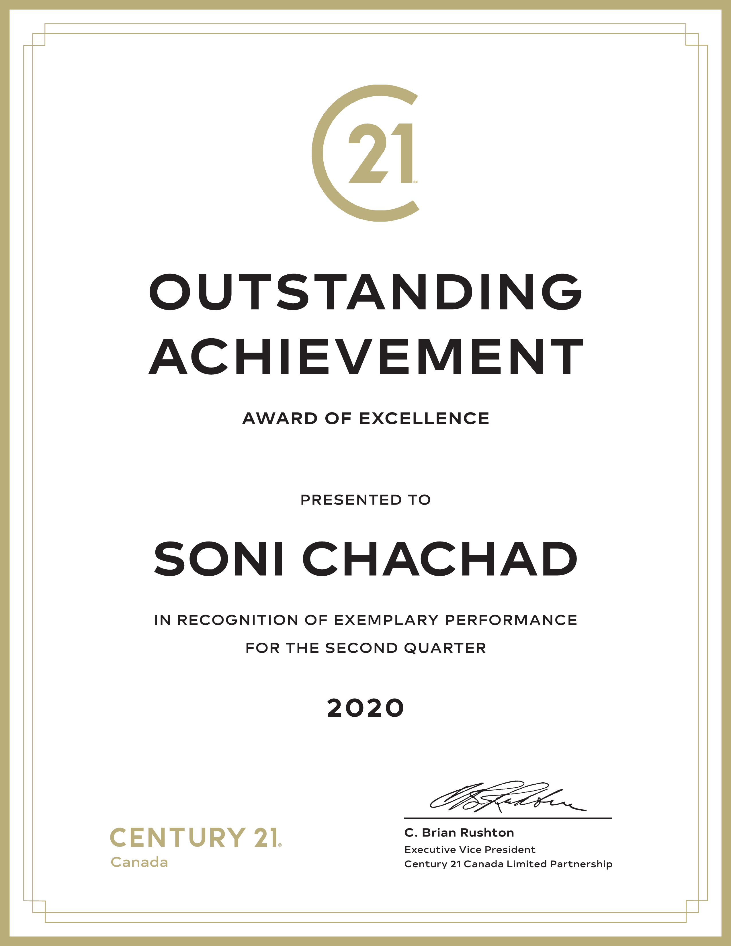 Outstanding Achievement Award of Excellence from Century 21 Canada for Q2 2020